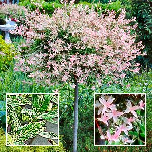 Especially eyecatching in the spring when new growth emerges pink. Pink, white and green foliage matures to speckled green and white. Shear
