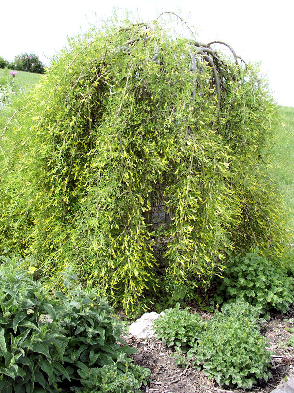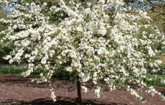 Deciduous, upright, small tree. The branches grow upright and will not droop except when in flower. The dark green leaves emerge late in the spring, and requires ample moisture and some protection from midday to afternoon sun to flower at its best. 8-10 ft tall 5-6 ft wide. Easily pruned to maintain size.