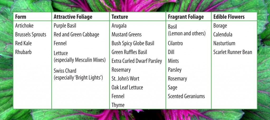 Color, texture and form are characteristics we keep in mind when combining plants in the flower garden. We plan flowerbeds so that plants enhance each other, repeating colors and shapes for continuity and flow. We add a variety of texture and form for diversity and interest. Vegetables, herbs and fruits can be just as vibrant, exciting, diverse and easy to combine as annual and perennial flowering plants are.