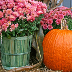 Chrysanthemums are a beautiful choice not only in the garden, but are equally lovely in welcoming porch pots, deck or patio containers, or even small indoor pots and arrangements. Add an extra touch of fall with rustic containers, such as wine barrels, baskets, or terra cotta pots, or glam up your mums in hammered copper or bronze pots that will accentuate their color. A burlap ribbon or bow can be a charming accent, and you can give more seasonal flair to mum arrangements or flowerbeds by adding pumpkins and gourds as fun decorations. Indoors, use small pails or pots for petit mum arrangements, or add them to larger arrangements with grain sprigs, dried pods, colorful leaves, or twists of grapevine for additional texture.